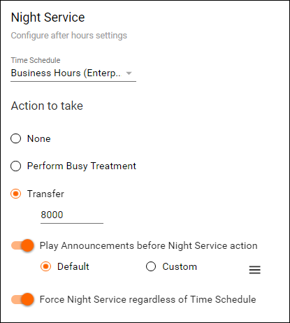 - Custom Announcements – select the announcement(s) that will be played when Night Service has been manually activated.