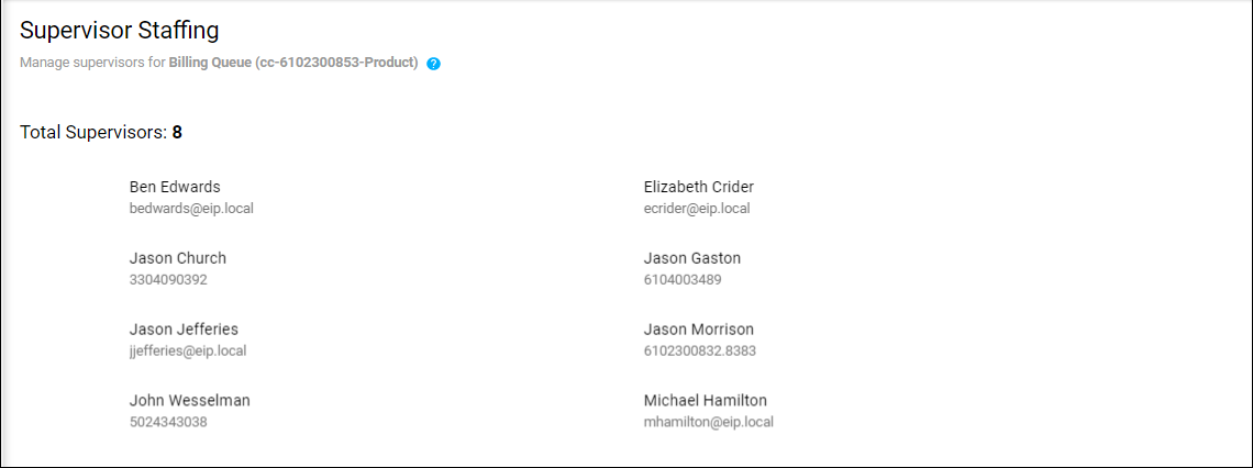 Supervisor staffing provides the ability to add, remove, and manage agents assigned to supervisors within a queue.