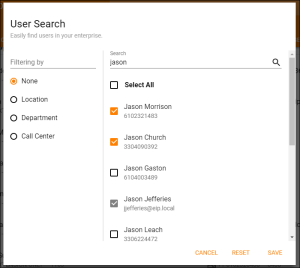2. Locate and select supervisors in the advanced search by Call Center, Location, or Department. Save.
