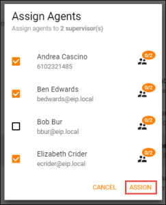 3. The Assign Agents pop-up will open. Select the Agents to which the Supervisors should be assigned and select Assign.