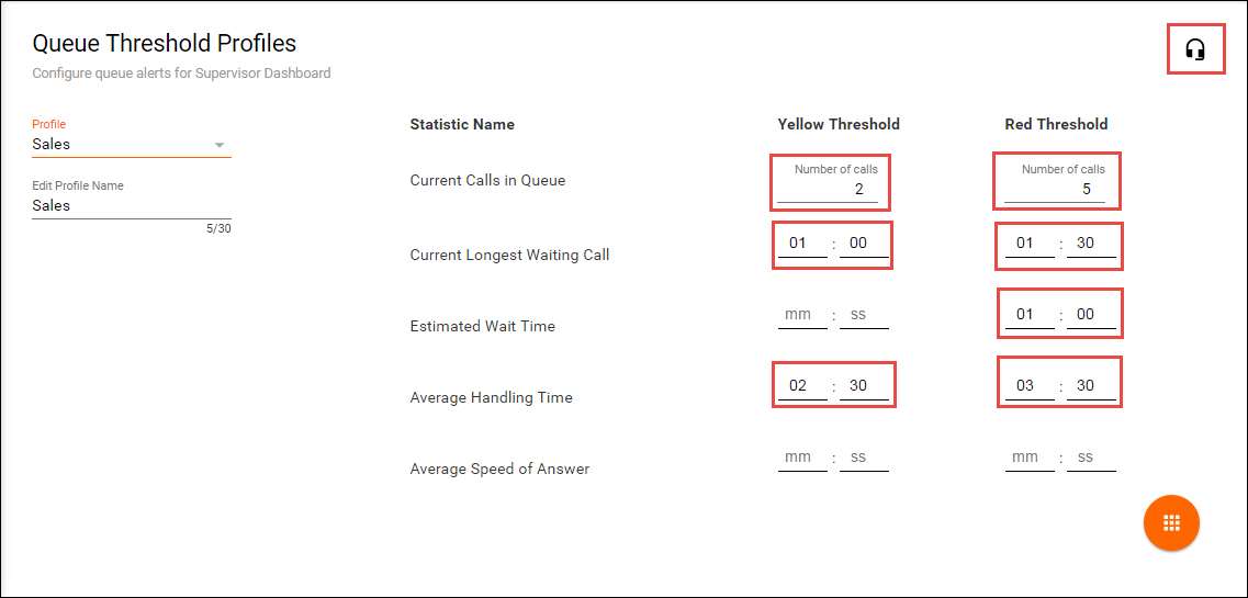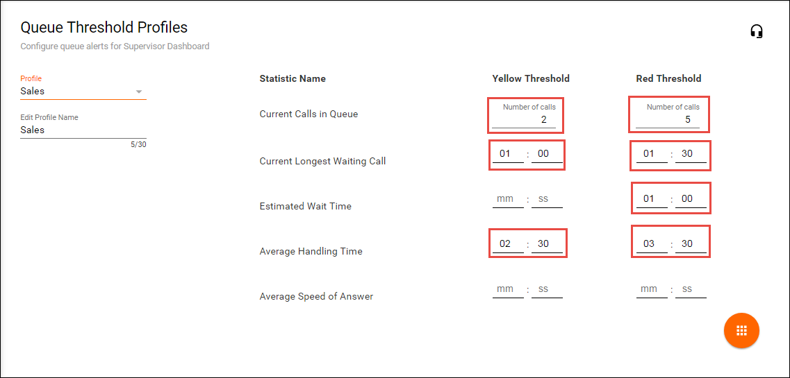 Queue Threshold Profiles are assigned to Call Center Queues and will provide yellow and red visual indicators when key queue metrics are not met in the Web Supervisor and Agent dashboards.