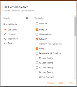 4. Locate queues in the advanced search by Call Center, Location, Department or Type. Once all agents have been selected, Save.