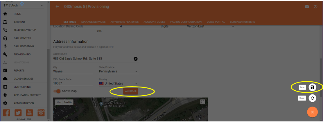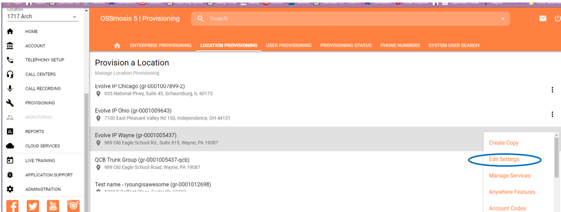 Provided the option Use group/department phone number for Calling Line Identity is selected, updates to the location in Ossmosis should update the emergency services database. To do so, navigate to the account and location to be verified/updated. Choose Location Provisioning under the Provisioning option is Ossmosis.