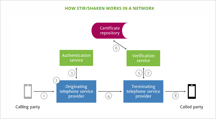 The STIR/SHAKEN protocol works similar to how web browsers authenticate webpages using digital certificates, with some minor differences. Instead of the server giving its certificate and the client (browser) determining the certificate's authenticity, STIR/SHAKEN will include an encrypted token, sent in-band in the call's SIP messaging and/or via an out-of-band API message, that the terminating carrier will use to validate the authenticity of the caller. This will occur on a call by call basis and the level of authenticity will be dependent on the caller. The following diagram shows an overview of the authentication process: 2