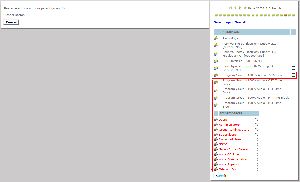 Step 8: You can sort the list of groups alphabetically by click on "Group Name". After this, search by using the navigation circles and arrows and add the user to the screen recording group by clicking Submit on the bottom. DO NOT FORGET TO DO THIS!