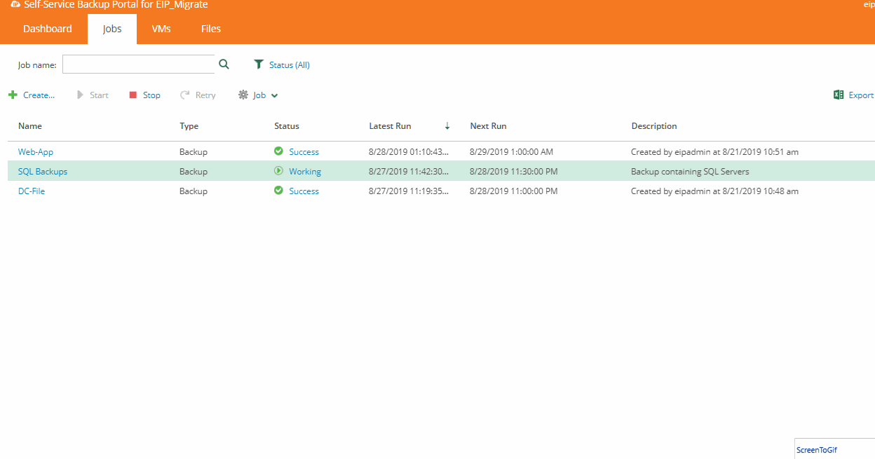 If needed you can manually start and monitor a backup job from the Self-Service portal. Once started, you can then monitor the job progress. You are also able to review past job logs from the same location.