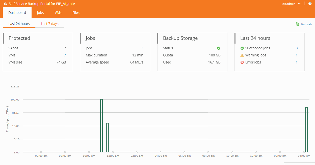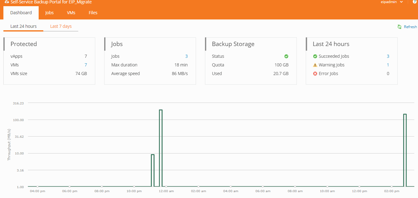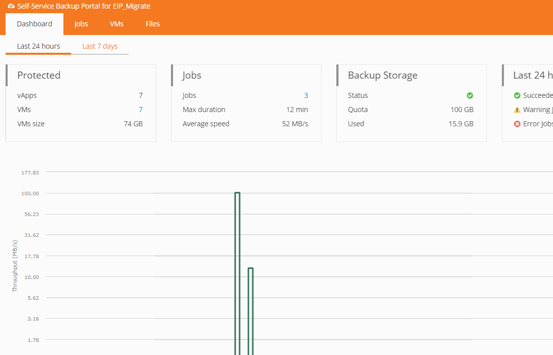 - The inital page will provide information for each VM and vApp including the rate at which they backed up as well as how much data was transferred.