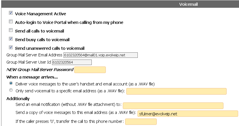 My seat's voice management is set to deliver voice messages to the user's handset AND Additionally, send a copy of the voice messages to this email address (as a .WAV file)