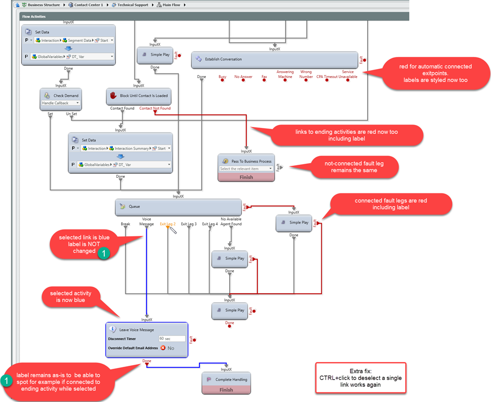 10. SETUP - Updated Color Code for connecting lines. 'Fault' and 'Complete Handling' line colors will be displayed in red within the Interaction Flow when connected. See Image08.