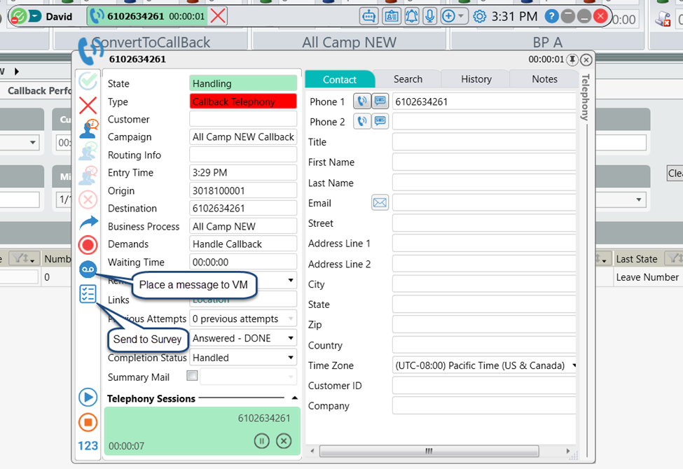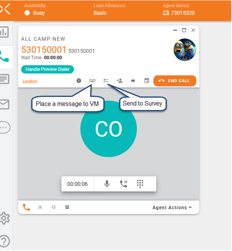 5. During outgoing calls generated by an agent (Manual External, Preview, Callback), when the remote party forwards all calls to a VM, the agent has a new capability to place a predefined message on the remote party VM while the agent can end the call and be available to the next call. See Image02 and Image03.