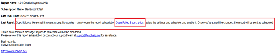 7. Report Scheduler - Email notification for a failed subscription due to an error, now includes a link to the failed report settings so the user can easily update the subscription. See Image05.
