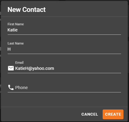 - The New Contact window will open. The contact must have either a phone number or email address to create the contact. Enter the First Name, Last Name, Phone, and/or Email address. Select the Create button to create the contact.