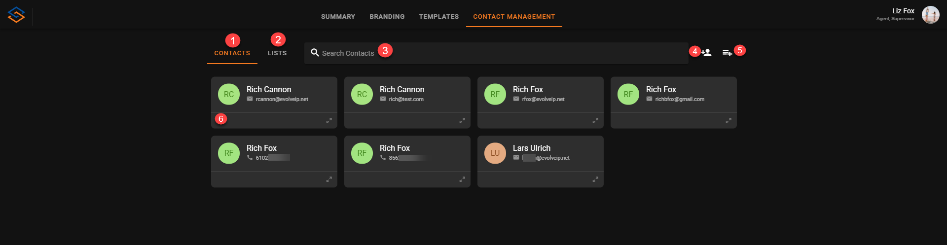 - Contact Card - individual contact card that displays all available information for the contact. Provides Admins and Supervisors the ability to manage the contact from within the contact card.