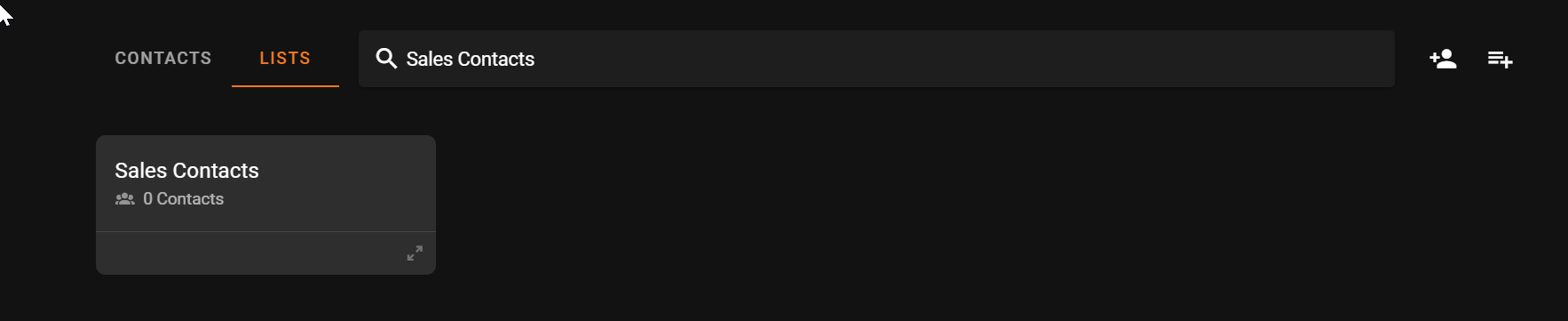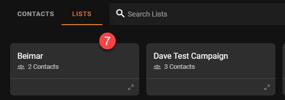 The initial list view will have a list card showing the name of each list and the number of contacts assigned to the list.