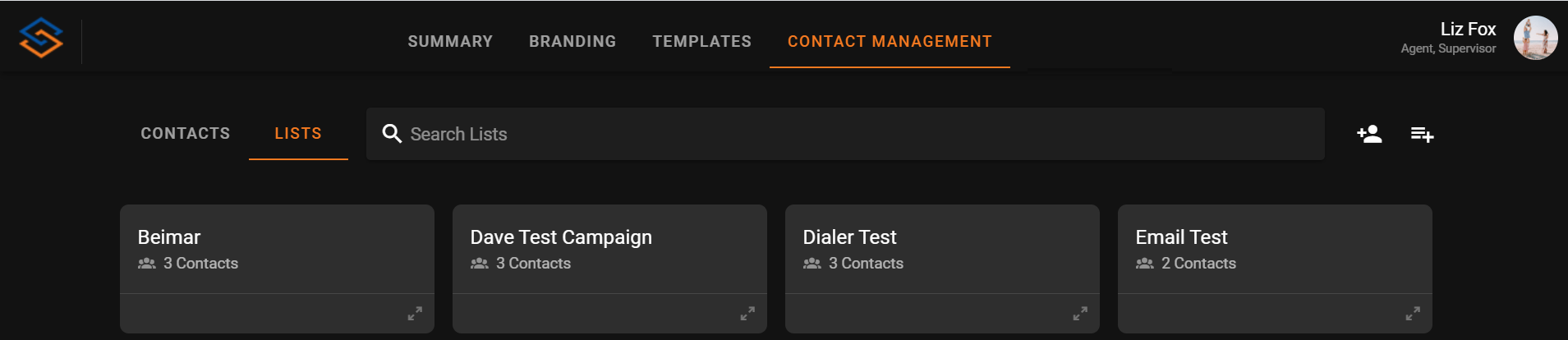 - Lists - provides all contact lists within the contact center. Provides the ability to manage, create, and edit contact lists.
