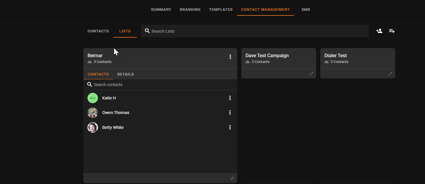 To edit an existing list click anywhere on the list card. This will expand the list to show the contacts assigned to the list and a details view which will provide the name of the Supervisor or Admin who created the list and the date and time the list was created.