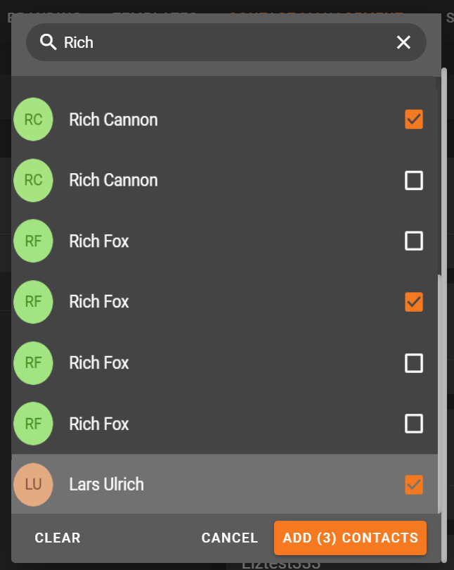 - The Contact List will open with an initial list of contacts found within the contact center. Search for or scroll to find the contact(s) you wish to add to the list. The Add Contacts tab will indicate the total number of contacts that will be added to the list. Select Cancel or Clear to clear the search or cancel adding contacts to the list. Select Add Contacts to complete adding the selected contacts to the list.