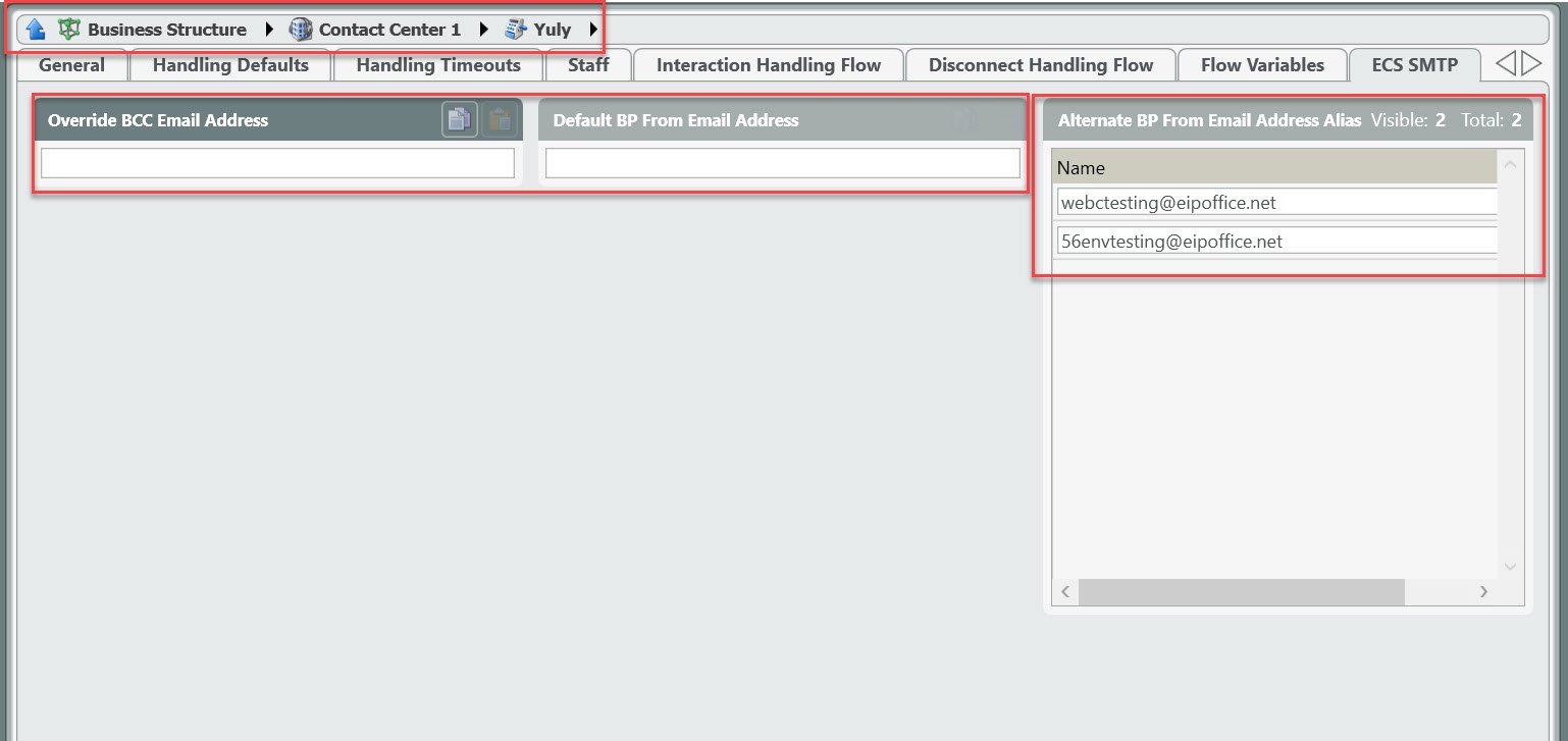 When XCS SMTP Relay has been configured, there will always be one email address that is configured as the default email address for all Business Processes. One reply and outgoing email signature can be created for the default email address that can be utilized by all agents. Within each individual BP configuration settings, there is an SMTP tab that allows Admins and Supervisors to assign other email addresses that can be utilized by the agent for email replies and outgoing email interactions other than the Contact Center default. A new default email address can be assigned to a BP within the individual configuration settings, but the Contact Center default level email address will always be available to the agent as well.