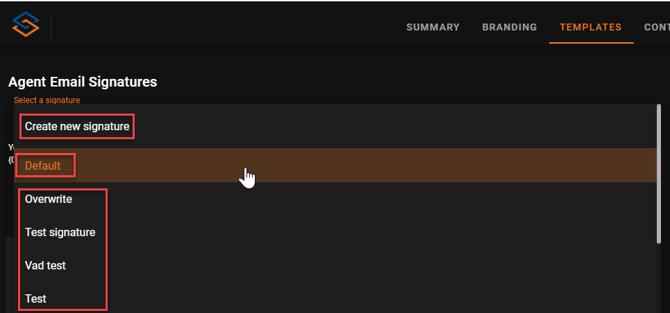- Signature Name is Default on original Admin portal access. This name can be changed and will also change the name within the Select a Signature drop down. Best practices recommends keeping it as default as to help easily recognize what is your default signature for your default email address that will be used by all agents.