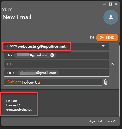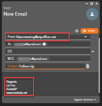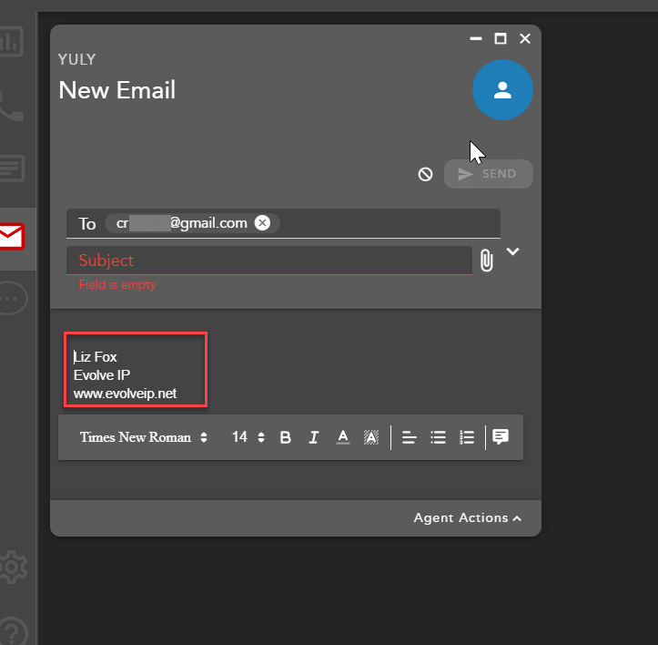 - When an agent initiates an outgoing email interaction their signature as defined in the template will automatically appear in the body of the email