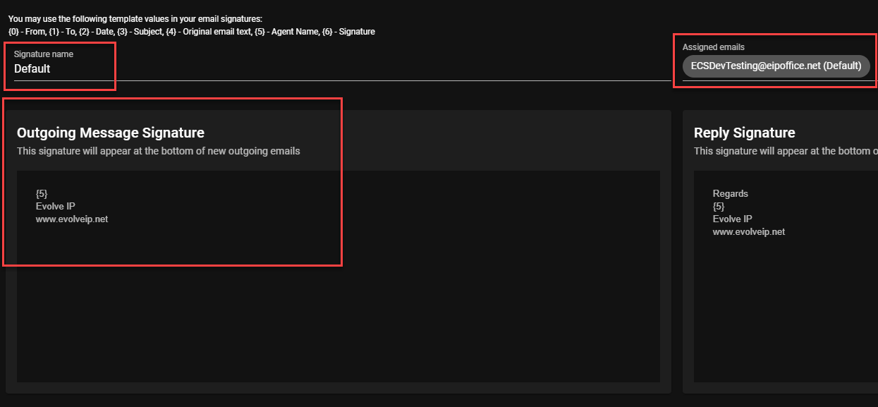 - Outgoing Message and Reply Signature. Configure the Outgoing Message and Reply signatures an agent would see when utilizing the default email address to reply to an incoming email interaction or create an outgoing message to be sent via the default email address.