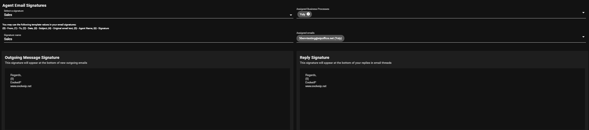 - In the example below the Sales signature was assigned only to the 56envtesting email address and will utilize the Outgoing Message and Reply Signature shown (agent UI screen shot example).