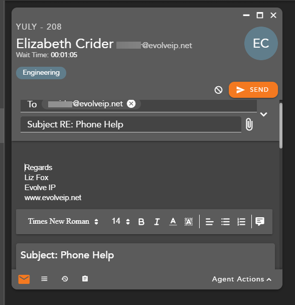 - When an agent replies to an incoming email interaction their reply signature as defined in the template will automatically appear in the body of the email.