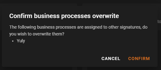 - If selecting a BP(s) that already has an email signature assigned, you will receive the following pop up. You can cancel the signature add if you wish to keep the current email signature already assigned or select confirm to overwrite the currently assigned email signature for the new one.