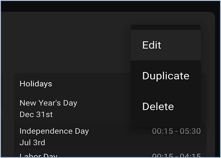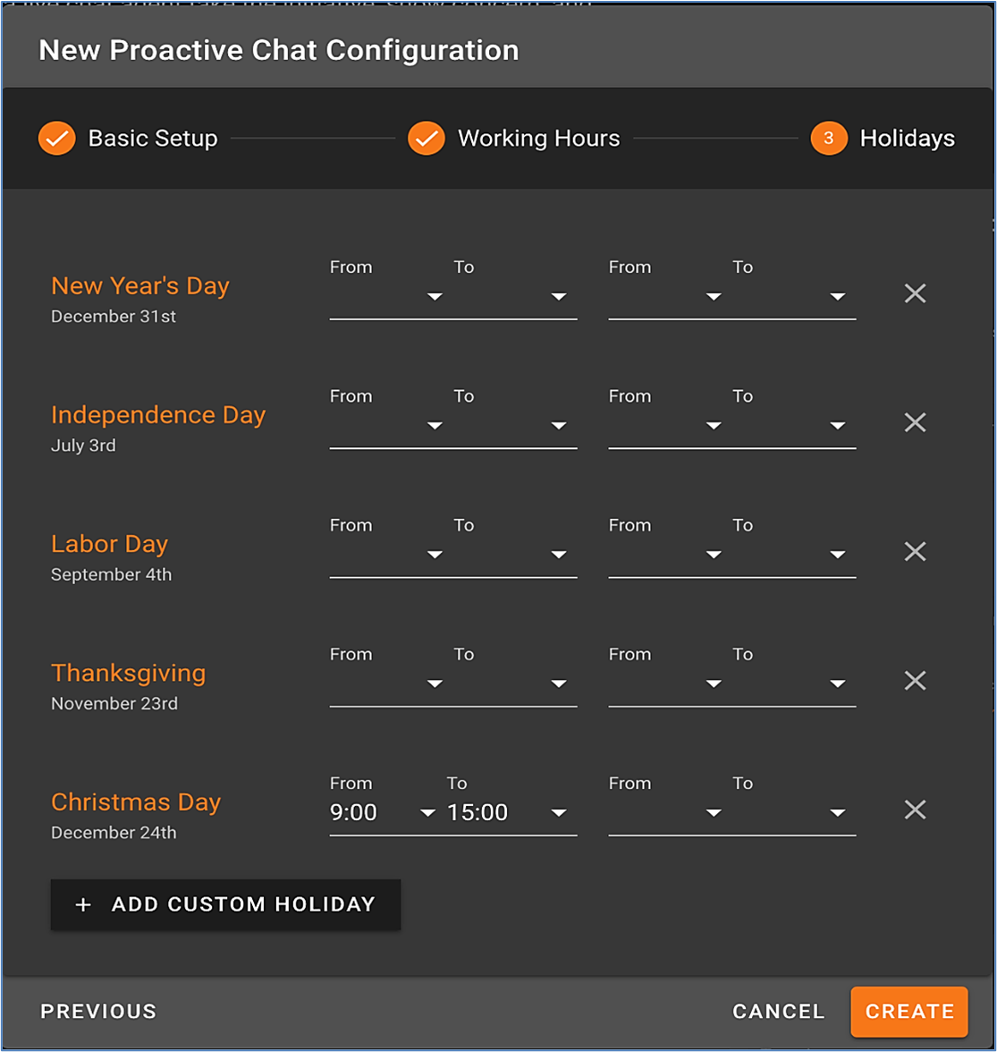 - Fill in the desired times for each holiday, and click "Create" to save the New Configuration.