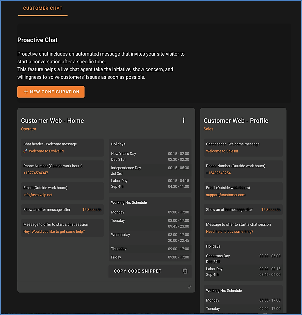 This section will help you create multiple behaviour configurations for each business process in your company. For instance, you can set different schedules for Sales, Technical support, and more.