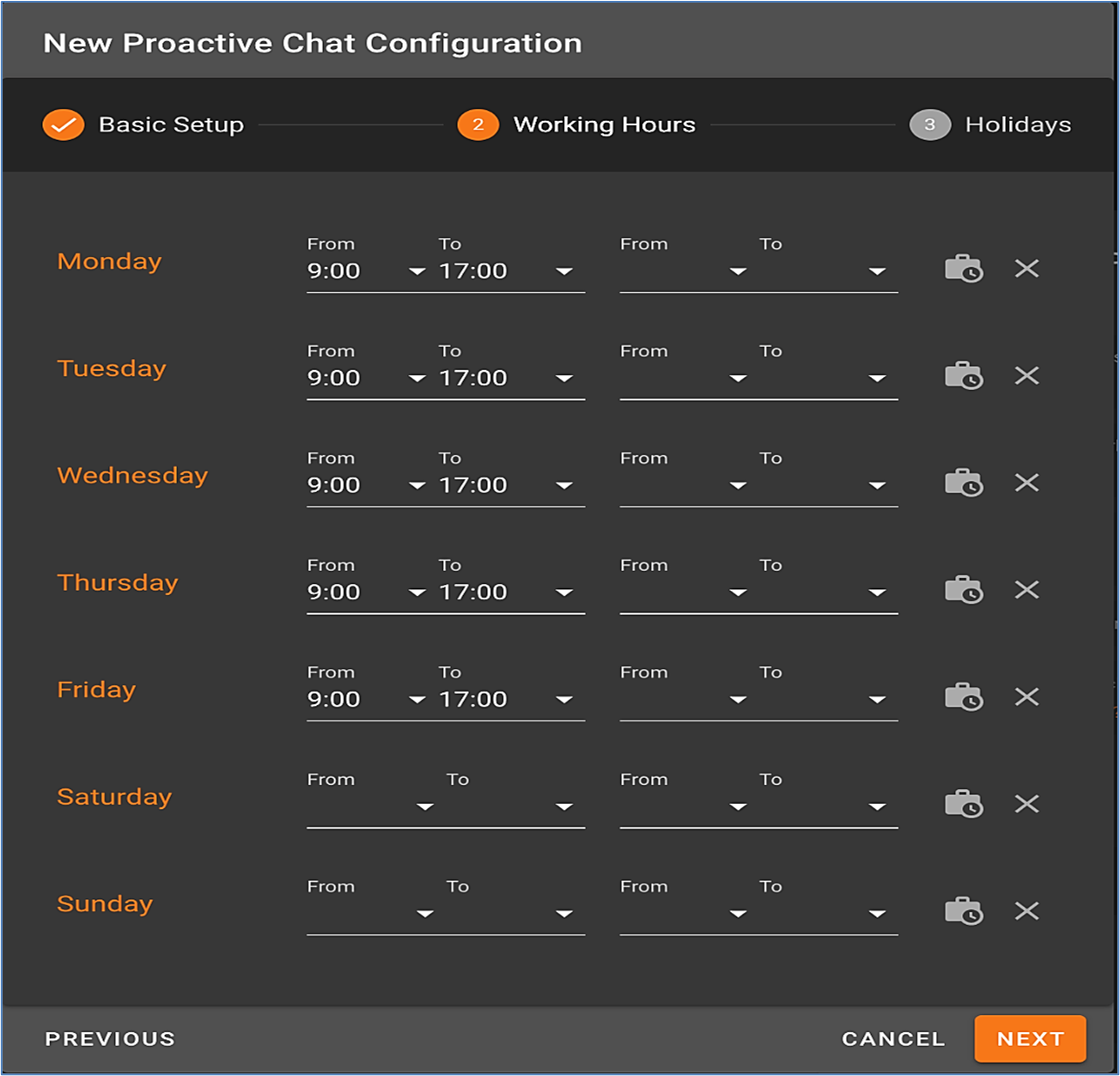- Fill in the desired times for each day, click "Next" to save working hours, and continue.