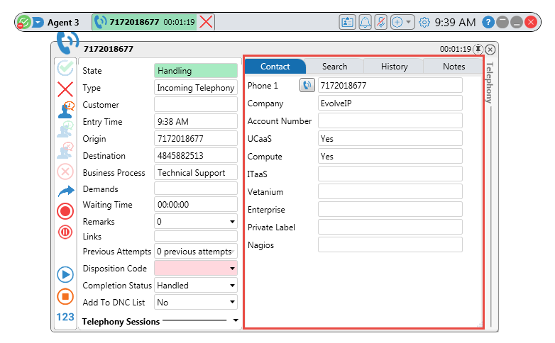 6. When an agent accepts an interaction they will see either the default CRM template or the Custom CRM display template assigned to the Business Process the interaction came through.