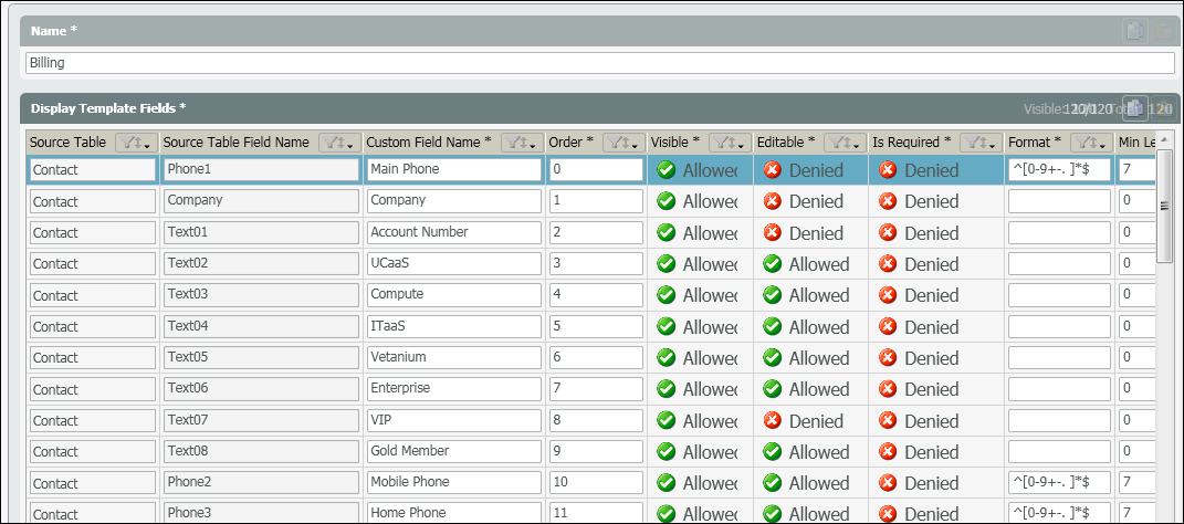 3. Edit the Custom Field Name, Order, Visible, Editable, and Is Required fields for the template.