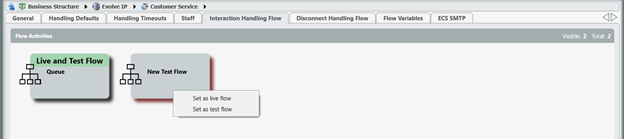 Right-clicking an Interaction Handling Flow will present an actionable menu to assign as either a live or test flow.