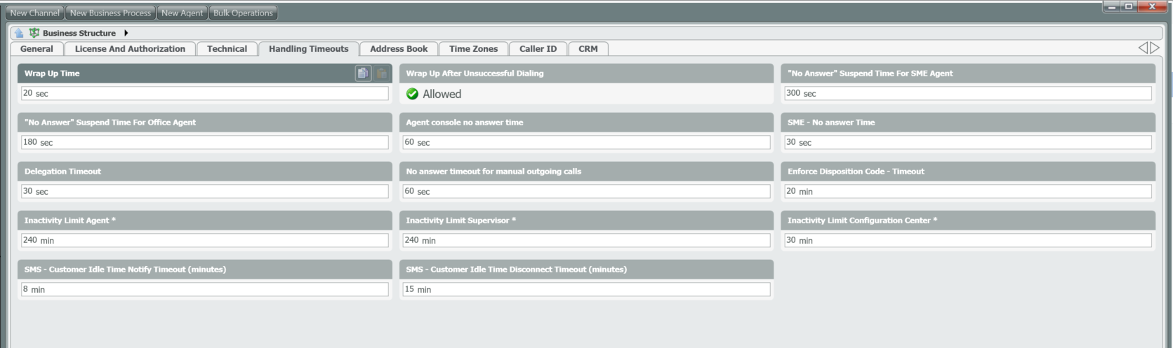 The Handling Timeouts Tab under the Business Structure provides Agent Handling Timeout Settings at the Enterprise level. Any setting that is editable in this tab will be applied to all Business Processes and Agents across the enterprise. Many of these settings will be discussed and set up by your Project Manager during implementation.