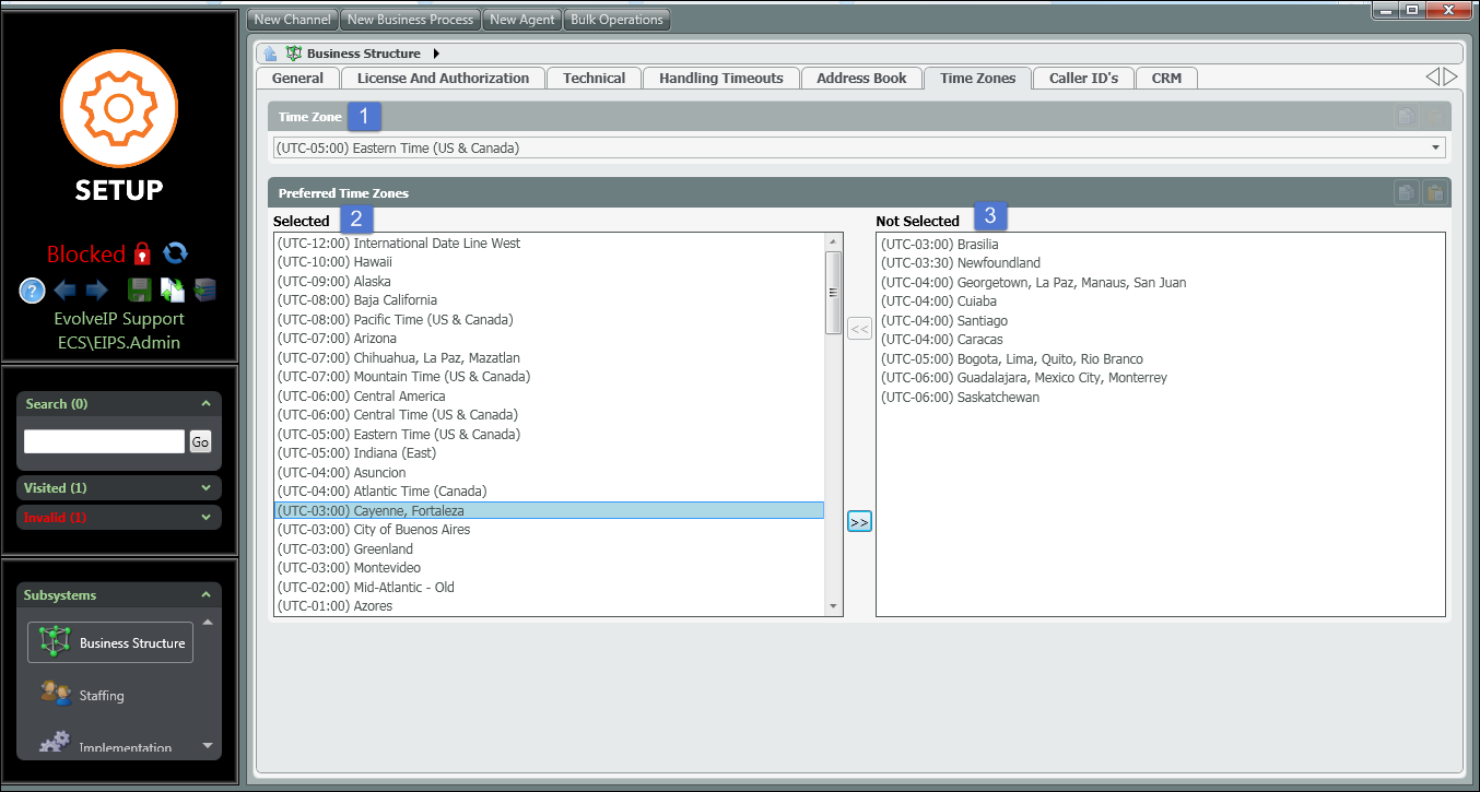 - Preferred Time Zones: Selected – these are the time zones available to Supervisors and Agents if they wish to adjust the default time zone set within the Setup Portal