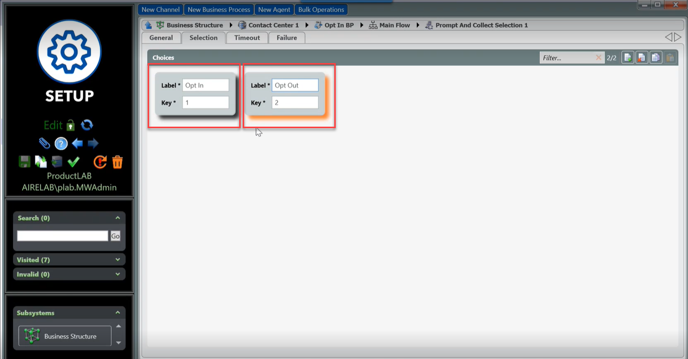 2-Opt into a survey opt-in can be set up within a business process. This method includes an initial question before an interaction to verify if a customer wants to receive the survey after the interaction. The customer has the option to opt in or opt out of the survey. To set up an opt-in question, the following setup is needed: