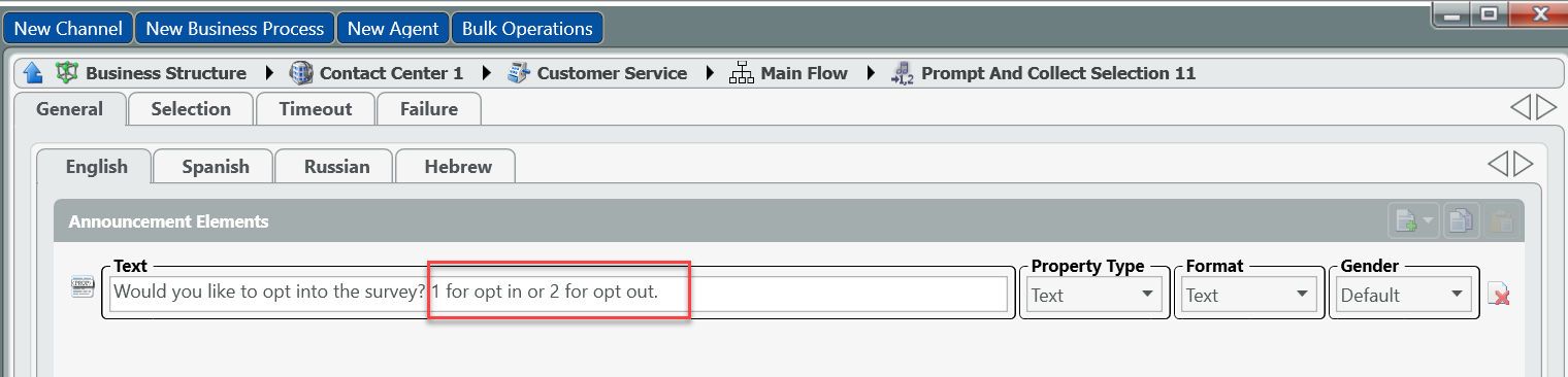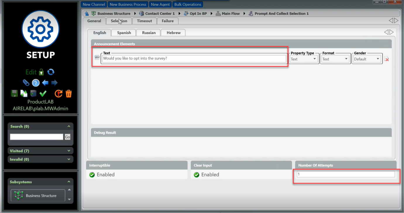 Open the Prompt and Collect Selection activity to customize the survey opt-in introduction message. The Announcement Element can be customized to play a specific initial opt-in request message that the customer hears before being routed into the queue. This allows the customer to either opt in or out of the survey that is given at the end of the interaction. The Number of Attempts to enter a response can be customized.