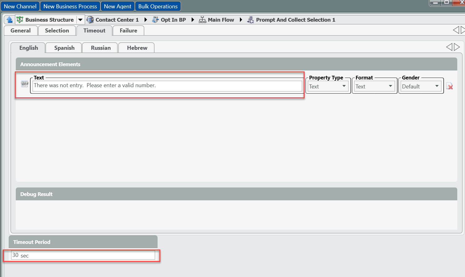 The timeout can be configured to play a specific message within a time frame in which no response was received.