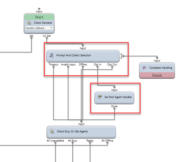-Connect all legs from the Prompt and Collect Selection and Set Post Agent Handler as applicable. In this example, all are connected to the Queue. In the example below, all legs connect to a check for available agents.