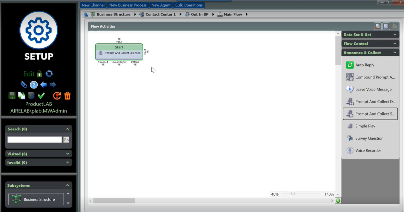 -In the Interaction Handling, add Prompt and Collect Selection activity from Announce and Collect in the right sidebar.