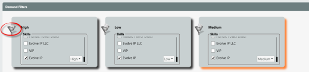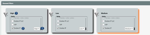 In the image below there are 3 demand filters (High, Medium, and Low). Each demand filter has one active demand (Evolve IP) in 3 separate proficiencies (High, Medium, and Low).