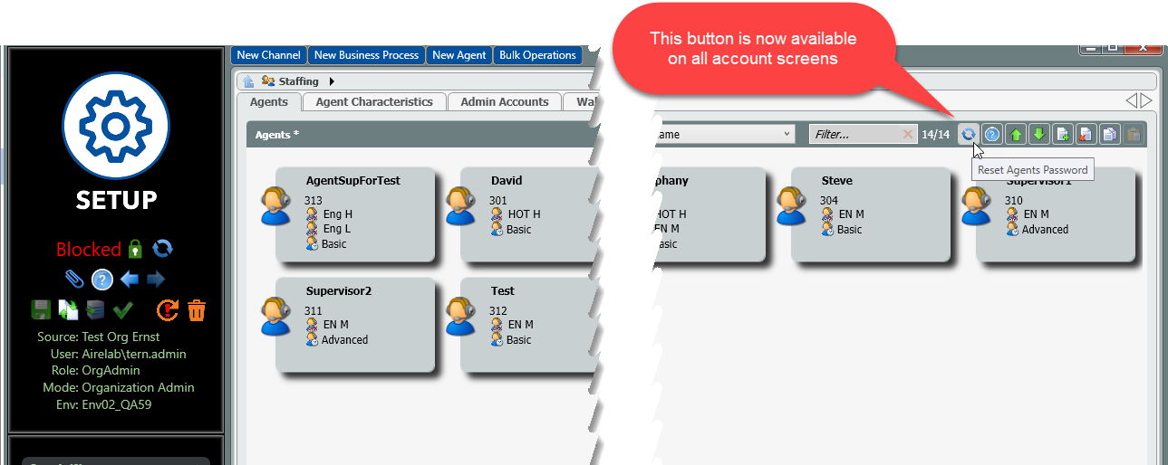 This functionality was previously only available in the Supervisor application. - If the user who is resetting/creating one or more passwords has an email address configured in Setup, this information is also sent to that address.