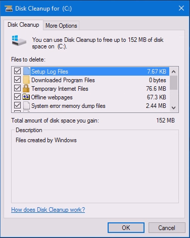 After the program runs for a few minutes and calculates the space it will be able to free up from various components, it will display a window with the options. Typically it is fine to check all the boxes and click OK and then select Delete Files. The program will run for several more minutes–sometimes up to an hour, depending on how long its been since it was last run–to clean up the disk. It's okay to use other software while this process runs.