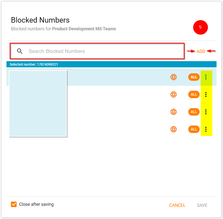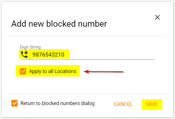 - Press SAVE and Return to Blocked Numbers dialog screen