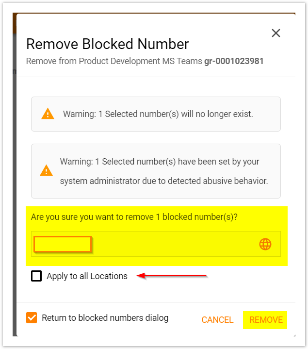 3) Remove Blocked number(s): Remove a blocked number from that location and/or Select Apply to All Locations (see screenshot below)